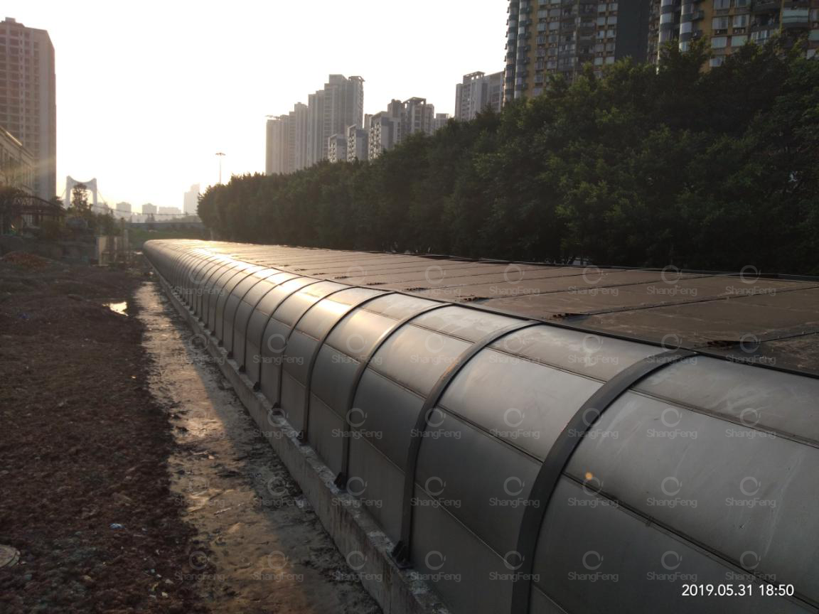 重庆市轨道交通环线二期(上浩~重庆西)工程起点为上浩站,线路顺时针走行,经海棠溪→罗家坝→四公里→大石路→鹅公岩大桥南侧轨道专用桥过长江→谢家湾→奥体中心→陈家坪→二郎→华龙大道至线路终点重庆西站。线路全长约18.333km。重庆市轨道交通环线二期项目由重庆市人民政府批准采用BT模式建设,我司2018年10月承接该项目 “南湖至海峡路区间”、 “海峡路至鹅公岩桥区间”声屏障、防抛网供货及安装工程。全封闭声屏障总长235.2m。钢结构采用桁架结构,两侧立柱为弧形立柱(采用型钢冷弯一次成型技术),中间跨度为15.4米;屏体两端采用金属声屏障,顶部采用耐力板。防抛网总长210米,使用不锈钢防抛网。该项目紧邻住宅小区,声屏障的设置很大程度上减轻了列车运营过程中噪音对轨道沿线居民生活的干扰,使周边噪声值满足当地环保部门要求的环境噪声标准值。同时全封闭屏障和防抛网在满足轨道内采光的前提下,有效防止了高空杂物掉到轨行区,保证列车运行的安全。